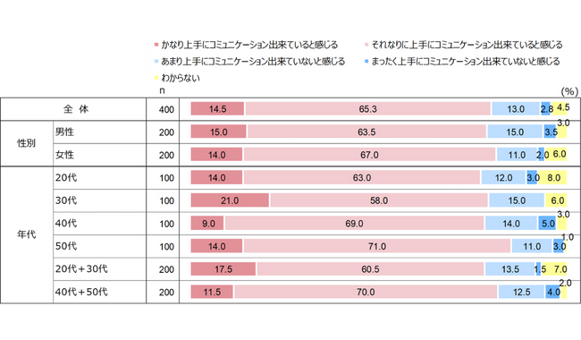 業務の効率性だけでなく、「相手との意思疎通」という部分において上手にコミュニケーションできているかを尋ねてみると、「上手にコミュニケーションできている」と考える人が79.8%にも上った。この傾向に性差や年代差は見られない。