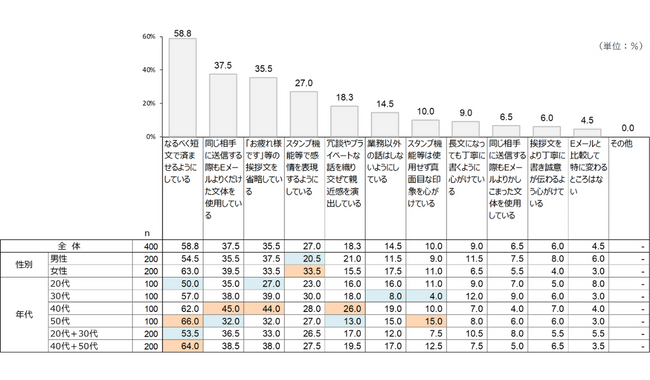 「Eメールと比較しての書き方の差」について尋ねたところ、「なるべく短文で済ませるようにしている」(58.8%)が1位で、全体の5割を超えた。これは微差ながら、上の世代のほうがその傾向が強く、若年層(20代+30代)が53.5%だったのに対し、ベテラン層(40代+50代)は64%となっている。