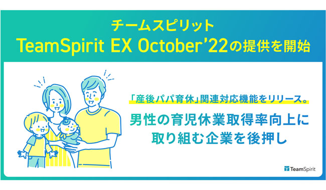 働き方改革プラットフォーム「TeamSpirit」シリーズを開発・提供する株式会社チームスピリット(本社:東京都中央区、代表取締役:荻島浩司、以下チームスピリット)は、大企業向けERPフロントウェア「TeamSpirit EX」の新バージョン、「TeamSpirit EX October’22」の提供を2022年10月27日に開始。休職・休業の申請に「産後パパ育休」メニューが新たに選択可能になった。