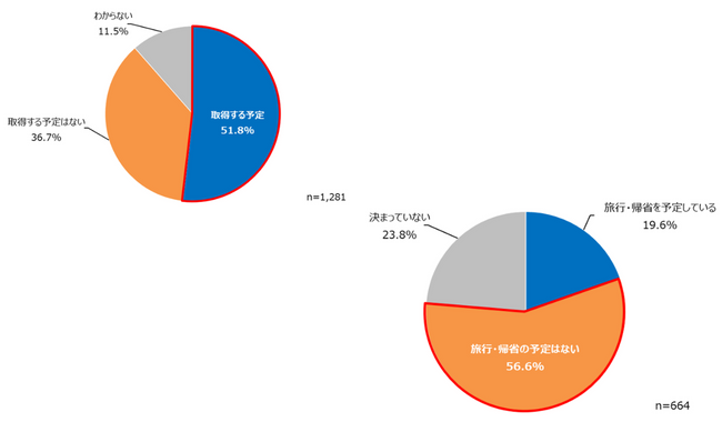 また、「取得する予定」と回答した人に、今年の年末年始に帰省や旅行など、遠出をする外出予定があるか尋ねたところ、「旅行・帰省の予定はない」が56.6%で最も多い結果となった。