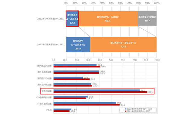 「取り決めやルールがある」「取り決めやルールがあった」と回答した人に、具体的な内容を尋ねたところ、最も多かったのは「会食の制限」で74.6%となった。前年の年末年始と比較すると、今年は「国内出張」「国内旅行」「会食の制限」「行動人数の制限」は減少している一方で、「海外出張」「海外旅行」はほぼ同率で変化はなかった。