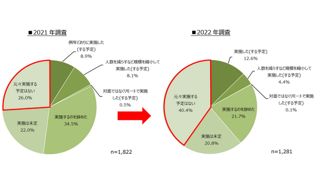 勤務先での忘年会の実施についても質問した。「実施した(する予定)」「人数を減らすなど規模を縮小して実施した(する予定)」「対面ではなくリモートで実施した(する予定)」の合計は17.1%で前年と比較して数値に大きな変化はなかった。ただし、「元々実施する予定はない」が40.4%で前年から14.4pt増加。コロナ禍3年目を迎え、忘年会を実施する文化自体が縮小傾向であると推測される。