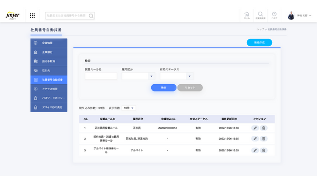 社員番号自動採番機能とは、従業員の雇用区分ごとに社員番号の自動採番ルールを設定できる機能である。これにより、「ジンジャー人事労務」で従業員を新規登録する際に、雇用区分ごとの自動採番ルールに応じて社員番号が自動採番され、業務負荷を軽減する。