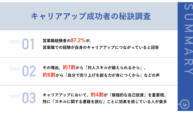 株式会社玄文社(本社:東京都港区)は、福山敦士氏の著書『稼ぐ!営業はどうキャリアを築く? 年収800万円が見えてくるこれだけの理由』を全国の書店、ネット書店において発売中。本著の発売に伴い、キャリアアップ成功者はどのような共通点を持っているのかを明らかにすべく、転職によって、年収800万円以上のキャリアアップに成功したビジネスパーソン100名に、キャリアアップ成功者の秘訣調査を実施した。