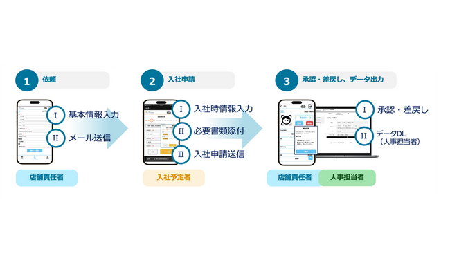 飲食や小売店舗では、アルバイトやパートの採用が多く、店舗責任者や入社予定者は書類作成や郵送などの入社手続きに手間と時間を要している。しかしながら、システムの導入や既存の人事給与システムの切替えはコスト負担が大きく、導入を諦めている企業も少なくないのが現状だ。