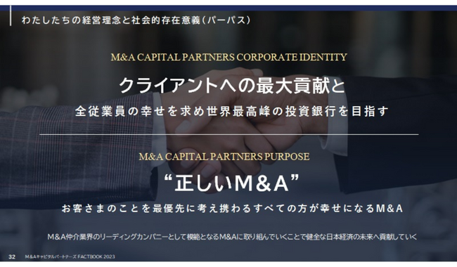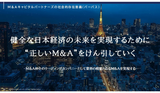 M&Aキャピタルパートナーズでは、M&A仲介業界のリーディングカンパニーとして、パーパス(社会的存在意義)に「健全な日本経済の未来を実現するために"正しいM&A"をけん引していく」を掲げ、「M&A」および「正しいM&A」の普及のため積極的に広報活動を行っている。今回、広報活動の一環として「FACTBOOK 2023」を公開した。