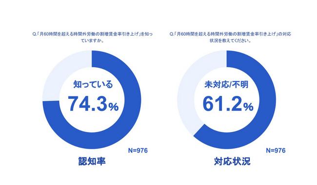 働き方改革関連法案の改正による「月60時間を超える時間外労働の割増賃金率引き上げについて知っているか」の問いに対して「知っている」が74.3%、「月60時間を超える時間外労働の割増賃金率引き上げの対応状況」については「未対応・不明」の回答が61.2%となり、60%超がこれから対応が必要であることがわかった。