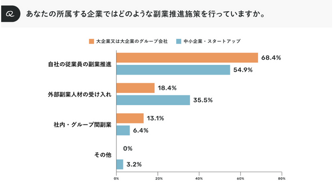 「大企業」または「中小企業・スタートアップ」で経営者、人事、経営企画などに携わる方々を対象に、 「あなたの所属する企業ではどのような副業推進施策を行っていますか」と尋ねたところ、大企業、中小企業・スタートアップともに 「自社の従業員の副業推進」が最多となった。