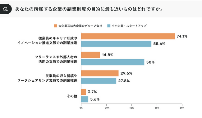 「あなたの所属する企業の副業制度の目的に最も近いものはどれですか」と尋ねたところ、大企業、中小企業・スタートアップともに「従業員のキャリア形成やイノベーション推進文脈での副業推進」の回答が最も多い結果となった。