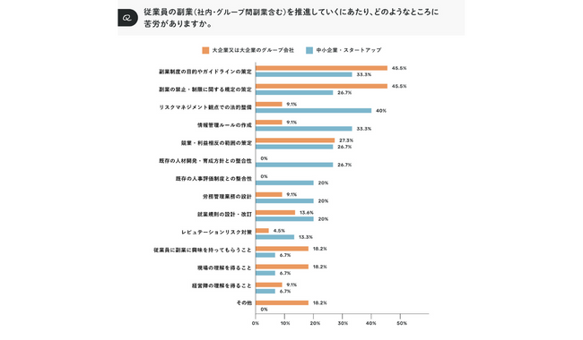 「従業員の副業(社内・グループ間副業含む)を推進していくにあたり、どのようなところに苦労がありますか」と尋ねたところ、大企業では、「副業制度の目的やガイドラインの策定」、「副業禁止・制限に関する規定の策定」、「競業・利益相反の範囲の策定」などが多く挙げられた。一方で、中小企業・スタートアップでは、「リスクマネジメント観点での法的整備」、「情報管理ルールの作成」などが多く見られた。