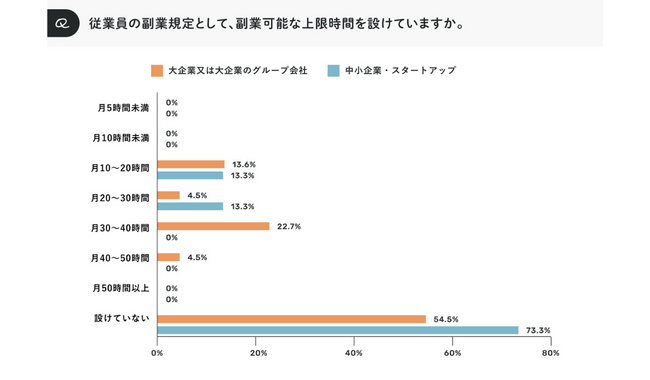 「従業員の副業規定として、副業可能な上限時間を設けていますか」と尋ねたところ、「設けていない」の回答が大企業/中小企業・スタートアップともに最も多い回答となった。