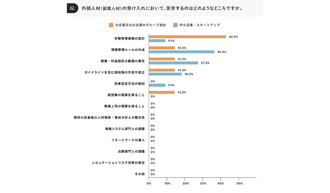 「外部人材(副業人材)の受け入れにおいて、苦労するのはどのようなところですか」と尋ねたところ、大企業または大企業のグループ会社では、「労務管理業務の設計」が、中小企業・スタートアップでは、「情報管理ルールの作成 」が最多となった。