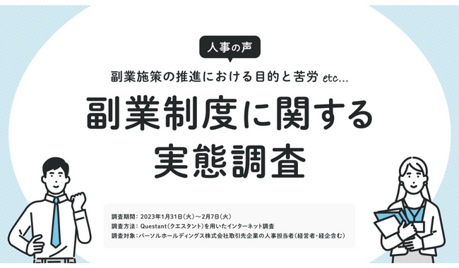 総合人材サービス、パーソルグループのパーソルイノベーション株式会社lotsful Company(本社:東京都港区、代表:田中みどり)が運営する副業人材マッチングサービス『lotsful』は、人事担当者や経営者を対象に、副業制度に関する実態調査を実施した。