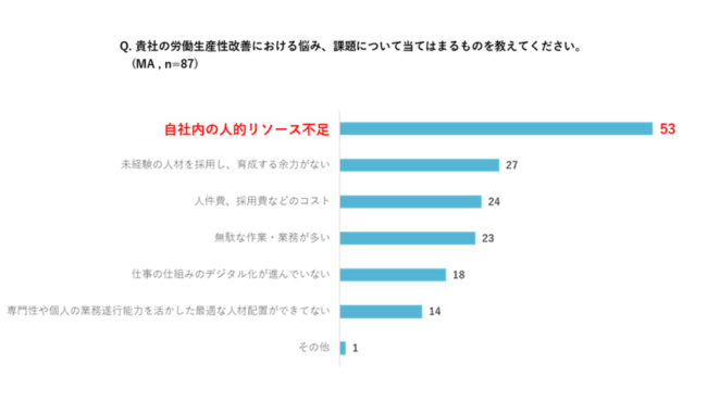 「改正労働基準法」を背景に、労働生産性改善における悩み、課題として、最も多くの企業が挙げたのは「自社内の人的リソース不足」。また、業務そのものの非効率や人材採用・教育に関連する事項を課題にあげる回答も多いことから、政府主導で推し進められるDXなどの取り組みも、リソース不足から“やりたいけど進まない”現状があることが見受けられる。