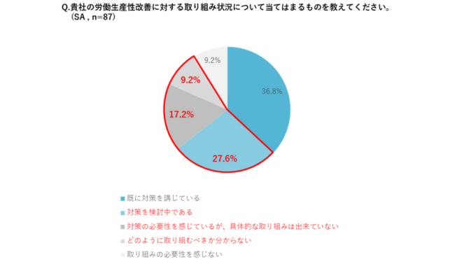 労働生産性改善に対する取り組み状況については、半数以上(54%)もの企業が実行に移せていないことが判明。前頁のアンケートからも、対策の必要性を感じながらも取り組みが出来ていない背景には、対策のための人材を確保・育成ができていない現状が見て取れる。