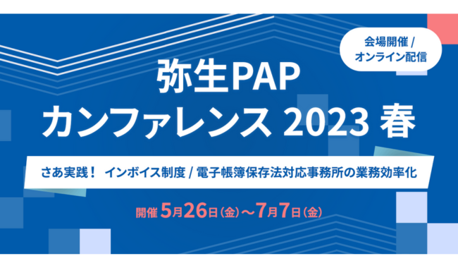 弥生株式会社(本社:東京都千代田区、代表取締役 社長執行役員:前山貴弘)は、2023年5月26日から7月7日まで全国7拠点とオンラインによる「弥生PAPカンファレンス 2023 春」を開催することを発表した。