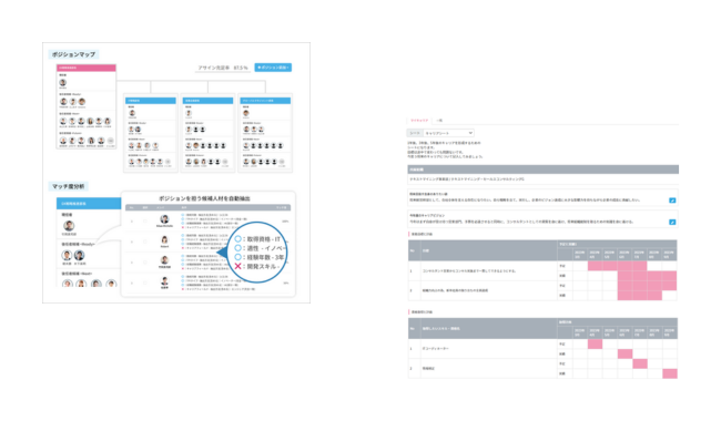 ポジションマップ機能にてキーポジションを作成し、蓄積されたデータから現在アサイン可能な人材だけでなく、3年後、5年後といった、将来キーポジションを担う候補者プールの作成を可能とし、さらにジョブディスクリプションにより、求める人物像を可視化することが可能だ。