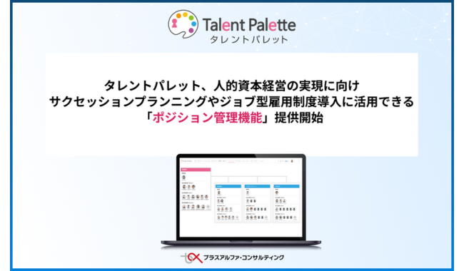 株式会社プラスアルファ・コンサルティング(本社:東京都港区、代表取締役社長:三室克哉 証券コード:4071)は、科学的な人材活用や人的資本経営、人事業務のDX化、リスキリングの推進などを背景に、多くの大手企業で導入が進んでいるタレントマネジメントシステム「Talent Palette(以下:タレントパレット)」にて、人的資本経営の実現に向け新たに「ポジション管理機能」の提供を開始したことを発表した。