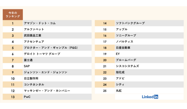 「今、働きたい会社」ランキング トップ25を発表 リンクトイン・ジャパン