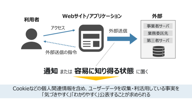 改正電気通信事業法では外部送信規律が制定された。対象事業者は、電気通信事業者として登録・届出をしているか否かに関わらず、他人の需要に応じて、Webサイトやアプリを通じてメッセージ媒介サービスやSNS、検索・情報提供サービスなどの事業を営む企業で、当該Webサイトやアプリにおいてクッキーをはじめとした生活者に関わるデータを外部に送信する場合、あらかじめ生活者に対し、そうした行為に関する通知や公表といった確認機会の提供が求められる。Webサイトやアプリを運営する多くの企業で早急な対応を求められることが想定され、また「送信される利用者情報の内容」や「送信先の氏名・名称」、「送信情報の利用目的」を、タグやSDKなどの情報収集モジュールごとに企業のWebサイト上などに記載する必要があるため、マーケティングツールを活用する企業にとって、対応負荷が増加するという課題がある。
