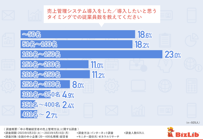 売上管理システムを導入するタイミングとして、従業員が101~150名と23%で最も多く、次いで従業員数が50名未満の18.6%と続いた。導入することで業務の効率化や売上予測が立てやすい一方で、コストの高さや外出先から利用できない不便さを感じる課題もあるようだ。