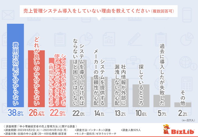 売上管理システムを導入していない理由としては、費用対効果が分からないが最も多く38.8%。どれが良いのか分からないについては26.4%、システムを入れても使いこなせなさそうと回答した方は22.9%という結果になった。ちなみにミスやトラブルの原因として「手入力の人為的ミス(40代/男性/福岡県)」、「誤入力が原因で、売上や買掛の計算が大幅に狂ってしまい、修正に手間取った(50代/男性/沖縄県)」の声が上がる。