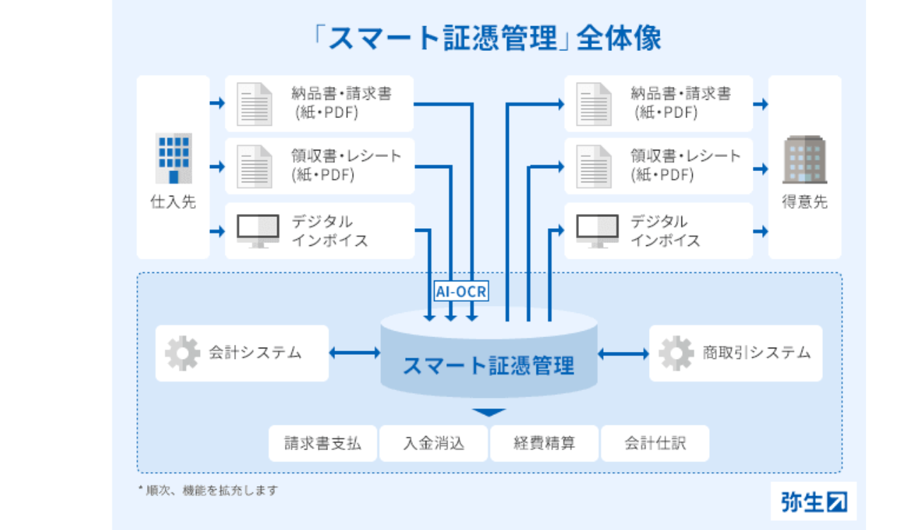 弥生のインボイス制度対応としては、証憑をデジタルデータでクラウド一元管理する「スマート証憑管理」を軸に対応する。スマート証憑管理とはインボイス制度・電子帳簿保存法まとめて対応でき、ペーパーレスの実現でコスト削減・業務効率をアップさせる会計管理システムだ。