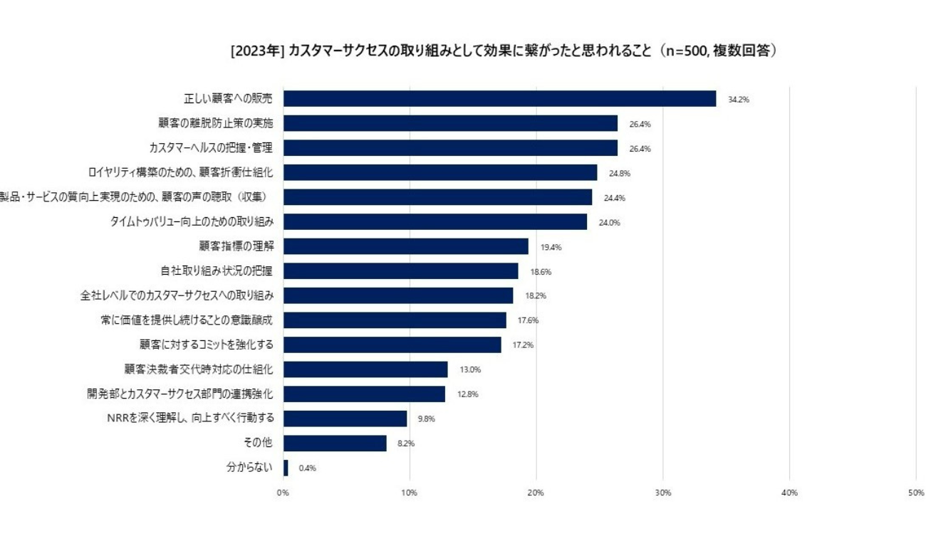 カスタマーサクセスの取組みで効果が出たと思われる施策については、「正しい顧客への販売(34.2%)」「顧客の離脱防止策の実施(26.4%)」「カスタマーヘルスの把握・管理(26.4%)」が上位。