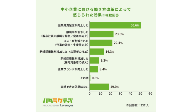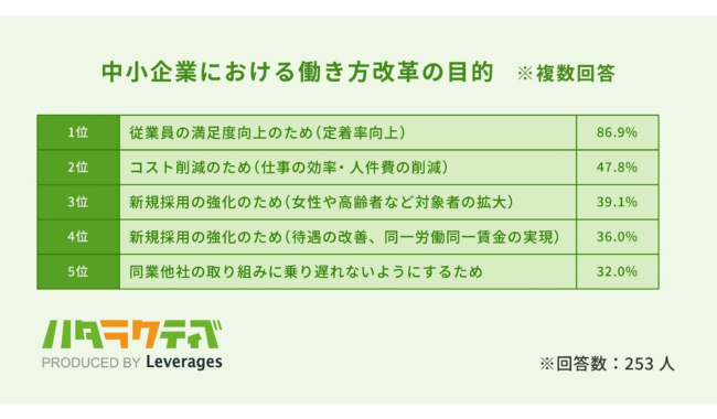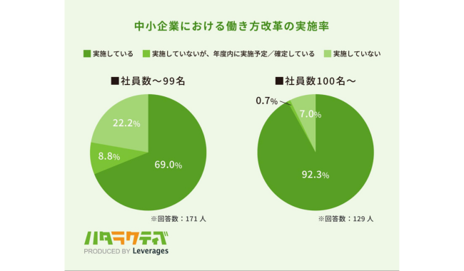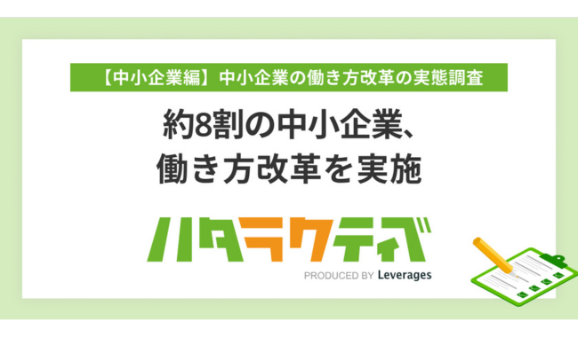 レバレジーズ株式会社が運営するフリーター・既卒・第二新卒向け就職支援サービス ハタラクティブは、中小企業の働き方改革担当者300名を対象に、働き方改革の実態を調査した。本調査は企業編・社員編に分けた発表となり、今回発表されたのは企業編。(*1 本調査において中小企業の定義は、従業員数500名未満の企業とする)