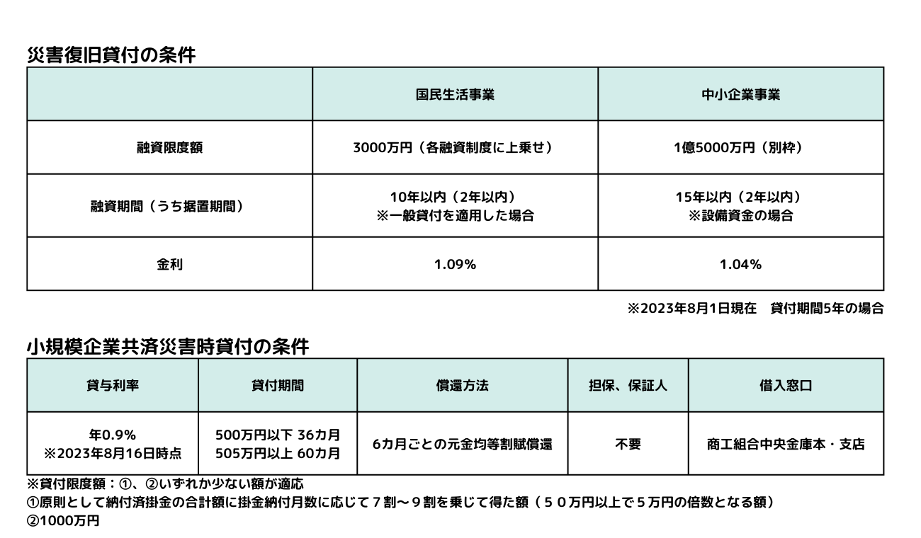 被害による貸付内容は災害復旧貸付の実施と小規模企業共済災害時貸付の2つ。