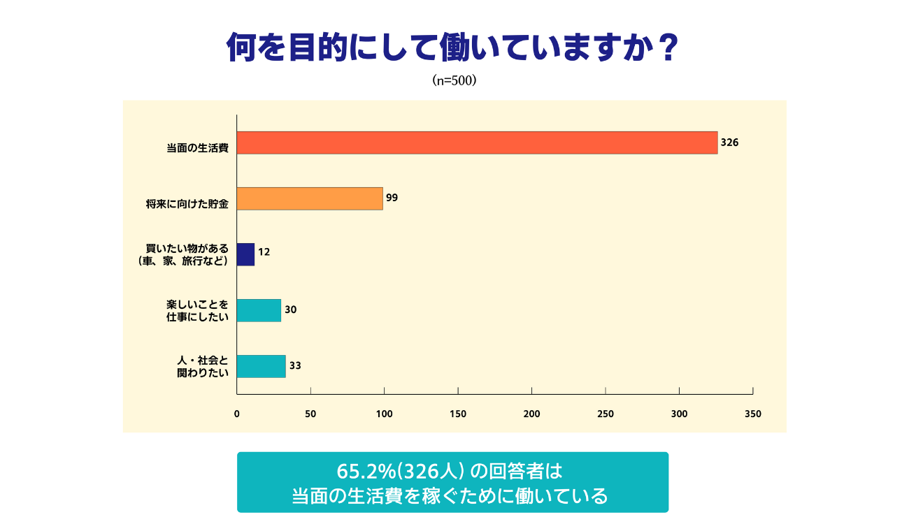 「何を目的にして働いていますか?」の質問には、「当面の生活費」が65.2%で最多。次いで「将来に向けた貯金」で19.8%(99人)。職場への不満に関するアンケートと同様、金銭面を重視する回答者が多かった。