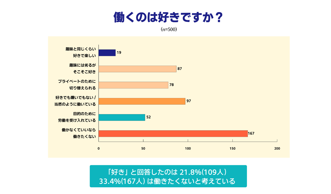 また、目的や仕事の内容、賃金を問わず、労働そのものを「好き」と感じている人の割合についても集計。「働くのは好きですか?」の問いに対して、単一の回答として最も多かったのは「働かなくていいなら働きたくない」で33.4%(167人)。程度に差はあれど、働くのが好きではないが嫌でもない中間層が45.4%(227人)で多数派となった。一方、「趣味と同じくらい好きで楽しい」「趣味には劣るがそこそこ好き」と回答した層は合計で21.8%(109人)。仕事が好きで働いている層にとって、「やりがい」「自己実現」はモチベーションの維持につながるが、回答の傾向から見ると、必要に迫られて働く労働者が多数派だと言えそうだ。