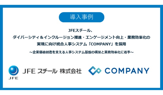 株式会社Works Human Intelligence(本社:東京都港区、代表取締役最高経営責任者:安斎富太郎、以下 WHI)は、JFEスチール株式会社(本社:東京都千代田区、代表取締役社長:北野嘉久、以下 JFEスチール)がダイバーシティ&インクルージョン推進・エンゲージメント向上・業務効率化の実現に向け、WHIの統合人事システム「COMPANY」を採用したことを発表した。
