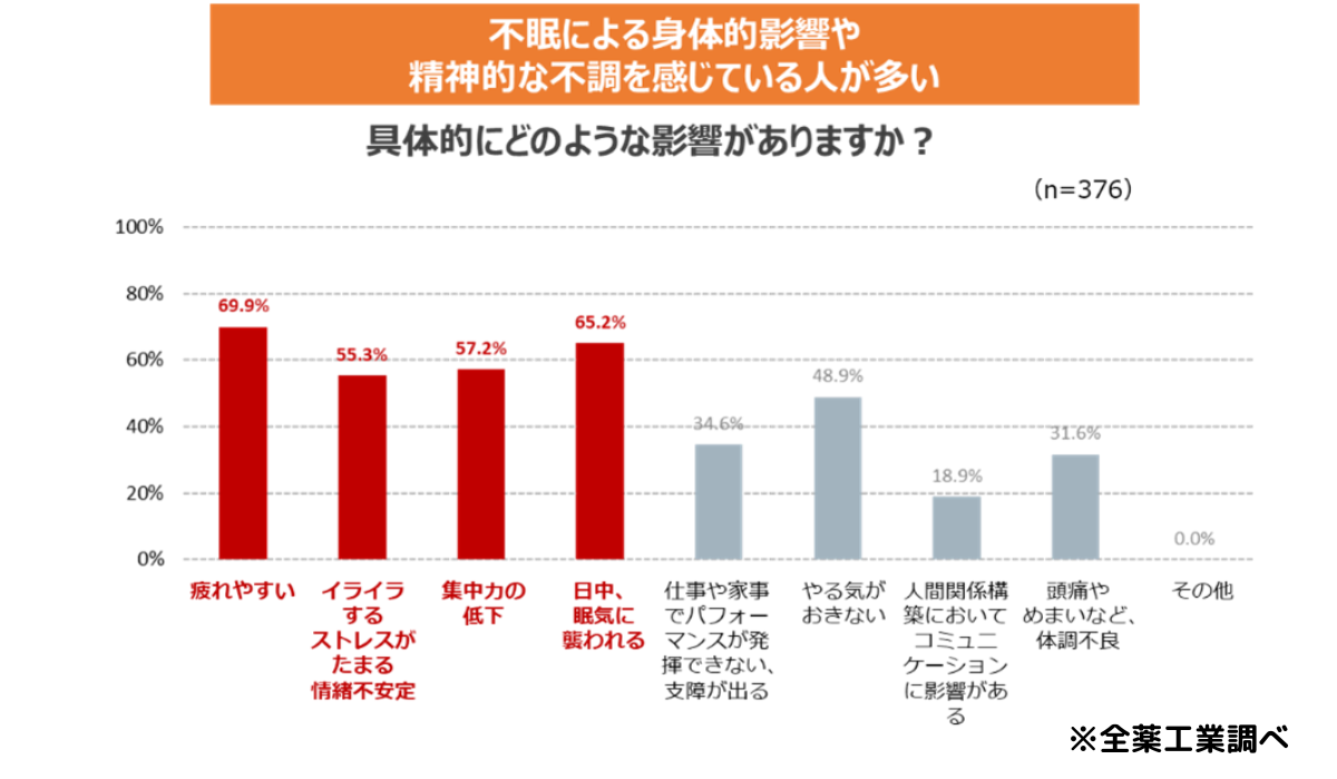 同社の行った調査によると、日々の生活でストレスを感じることがある方は約89%、不眠に悩む方は約70%にも及ぶ。不眠に悩む人のうち約72%が日常生活に影響を感じており、具体的な影響については「疲れやすい(69.9%)」「イライラする(55.3%)」「集中力の低下(57.2%)」「日中、眠気に襲われる(65.2%)」が上位。不眠による身体的影響や精神的な不調で悩んでいる人が多いことが示唆される。