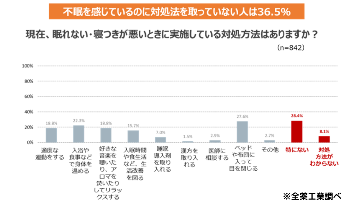 不眠を感じている方に実践している対処法について、同社の調査によると「特にない(28.4%)」「ベッドや布団に入って目を閉じる(27.6%)」「入浴や食事などで身体を温める(22.3%)」「好きな音楽を聞いたりアロマを焚いたりしてリラックスする(18.8%)」が上位にあがっていた。不眠を感じている人は多いが、根本的な改善には繋がらない簡易的方法でしのいでいるようだ。