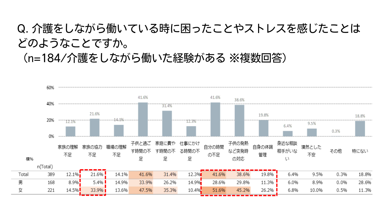 また実際に育児をしながら働いた際に得られた・活用した支援については「配偶者・パートナーの協力(61.4%)」「親・義親の協力(54.5%)」「保育園(37.3%)」。困ったことやストレスに感じたことは「自分の時間不足(41.6%)」「子供と過ごす時間の不足(41.6%)」「子供の発熱など突発時の対応(38.6%)」が上位にそれぞれあげられた。子供の発熱など突発時の対応においては男性よりも女性の方が困った割合が多い傾向にある。