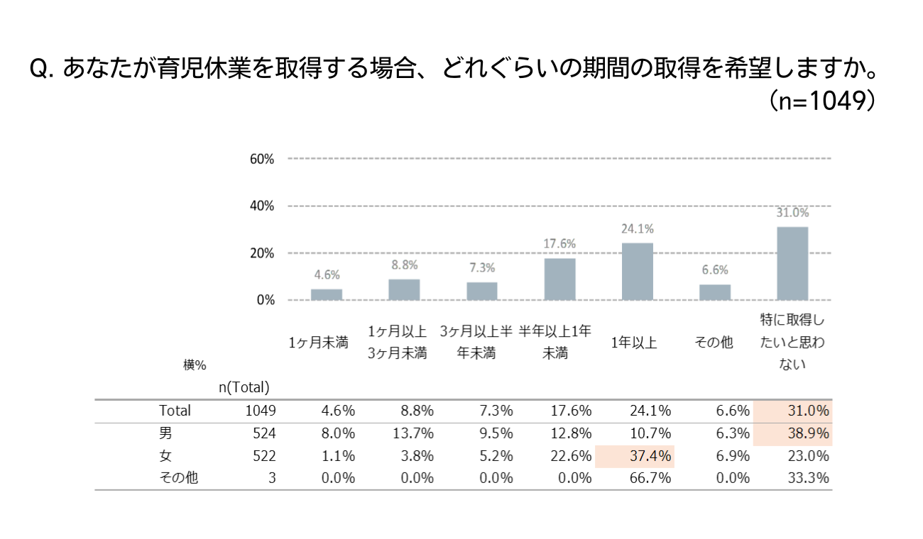 育児休業、女性は1年以上に対し男性は取得したいと思わないが多数