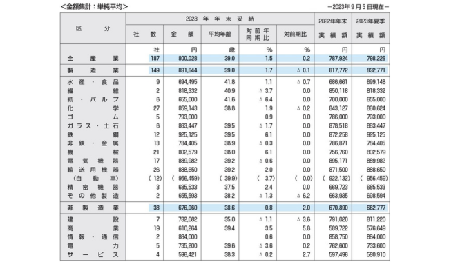 東証プライム上場企業の全産業ベース(187社、単純平均)で80万28円(対前年同期比で1.5%増)となり、1970年に調査を開始して以来、初めて80万円台となった。産業別に見ると、製造業は同1.7%増、非製造業は同0.8%増で、業種によるバラつきが目立つ。