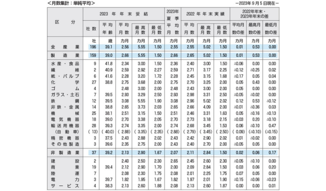 全産業196社の平均で2.56カ月。同一企業で見た場合、前年同期(2.55カ月)から0.01カ月の微増となった。最高月数は5.55カ月と前年同期(5.02カ月)を上回り、最低月数は1.50カ月で前年同期(1.50カ月)と同水準である。