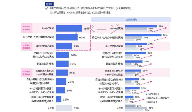「1on1の実施」56%、「自己申告・社内公募制度の実施」47%、「キャリア面談の実施」35%が上位となった。また全ての取組について、1001名以上の大企業の取り組みが大きく進んでいることが分かった。