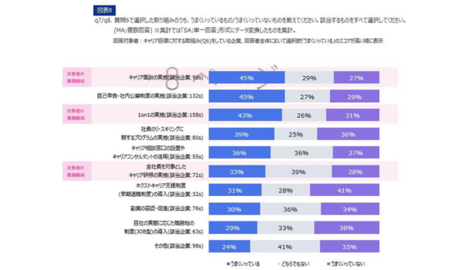 また、施策に取り組んでいる企業がどのように評価しているかを聞いたところ、うまくいっている施策として「キャリア面談の実施」45%、「自己申告・社内公募制度の実施」45%、「1on1の実施」43%が上位を占めた。ただし、全ての施策について実施企業の半数以上が課題を抱えていると想定される結果となった。