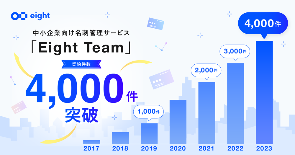 Sansan株式会社(以下Sansan)は、営業DXサービス「sansan」やインボイス管理サービス「BillOne」、契約DXサービス「ContractOne」などの法人向けサービスの提供とともに、個人のユーザーを対象にした名刺管理アプリ「Eight」を提供。スマートフォンで撮影するだけで名刺を管理でき、情報共有も可能なサービスとして、2012年にサービスを開始して以来、2023年現在の利用者数は330万人を超え、中小企業向け名刺管理サービス「Eight Team」の契約件数が4000件を突破している。