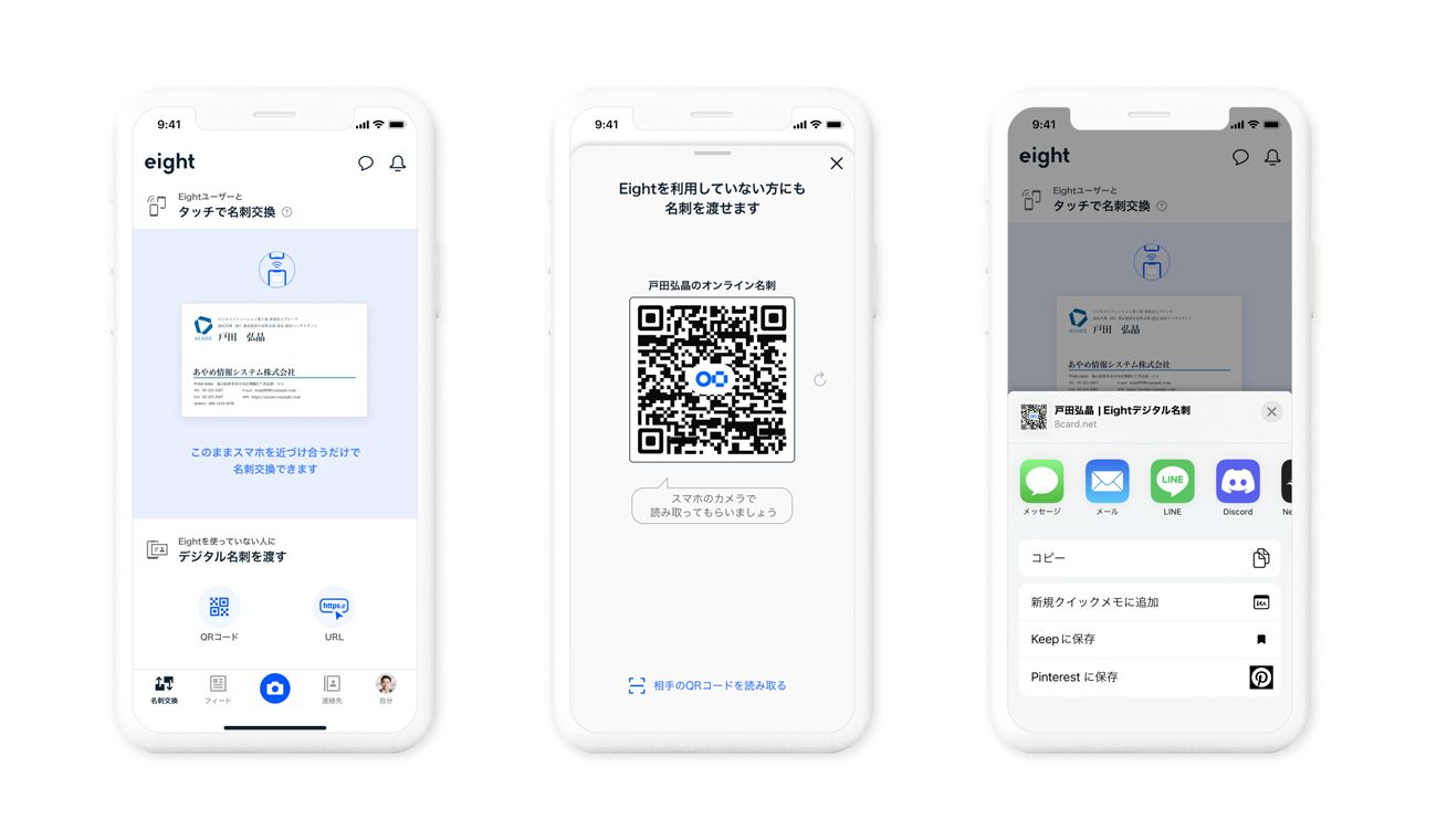 名刺交換相手がEightアプリのユーザーではない場合には、従来から実装されているQRコードとURLで対応することが可能だ。今回のリニューアルでこの2つの機能を名刺交換のために集約し、より簡単に使えるようになった。
