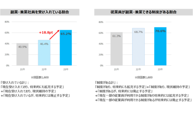 中途採用を実施した企業が副業・兼業人材を受け入れている割合は、65.2%で前年比+18.8ptとなり、大幅に増加した。また、従業員の副業・兼業を認可する制度がある企業は70.6%(前年比+1.9pt)と、3年連続で増加。前年までは副業人材を受け入れている企業が46.4%、認可する制度がある企業が68.7%で22.3ptの大きな差があったが、今年は受け入れる企業が増加し、その差が5.4ptまで縮まった。