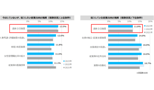 今はしていないが導入したい施策については「週休3日制度(13.5%)」が3年連続で1位となった。一方で、現在導入している施策については 、「週休3日制度(11.8%)」が3年連続で最下位となっている。また、週休3日制度導入の課題は「人手不足(46.1%)」が最多で前年よりも増加。