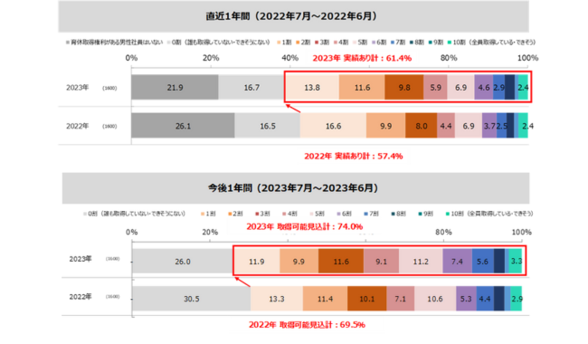直近1年間に男性育休取得の実績がある割合は61.4%で、前年の57.4%から4.0pt増加した。今後1年間で男性育休が取得可能になる見込みの企業は74.0%で、今後取得はさらに進むと見込まれる。しかし、育休取得率で最も高かったのは前年に引き続き「1割(男性育休取得権利がある男性のうち1割は取得できた)」。企業の男性育休取得推進への課題では、「取得希望者が少ない(51.2%)」がもっとも多く、「代替要員の確保(46.0%)」が続いた。