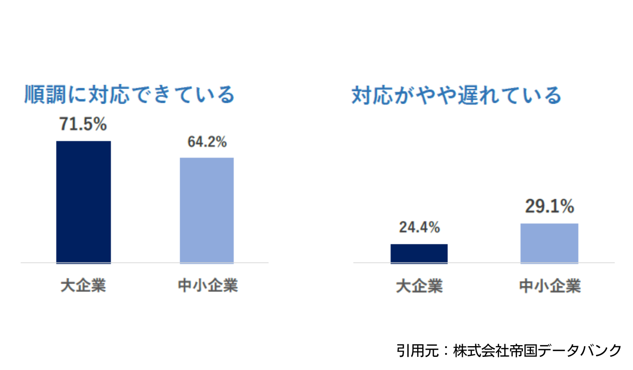 対応がやや遅れている要因としては、仕入税額控除に対するルールが細かいことや免税事業者対応の税区分などの処理内容が増えることによる業務量の増加や人材不足などが挙がった。一方で順調に対応できていると回答した企業は、社員や取引先に対して早めの対処が功を奏したようだ。