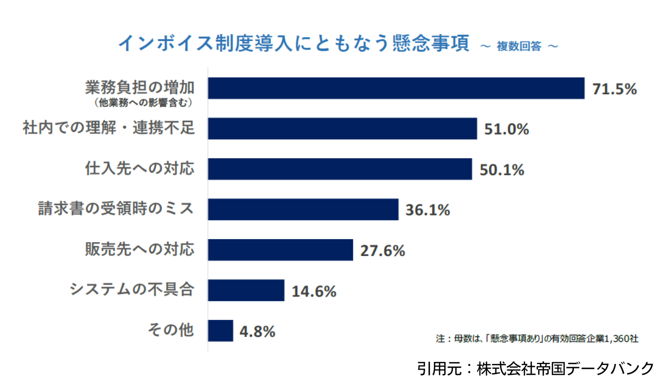 インボイス制度による懸念事項については「業務負担の増加(71.5%)」「社内での理解・連携不足(51.0%)」「仕入先の対応(50.1%)」が上位を占めた。企業側からは下記コメントが寄せられている。