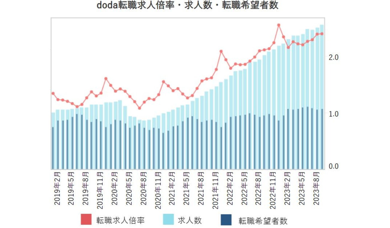 doda転職求人倍率2023年9月は2.39倍(前月差+0.01ポイント)求人数は2カ月連続で過去最高を更新