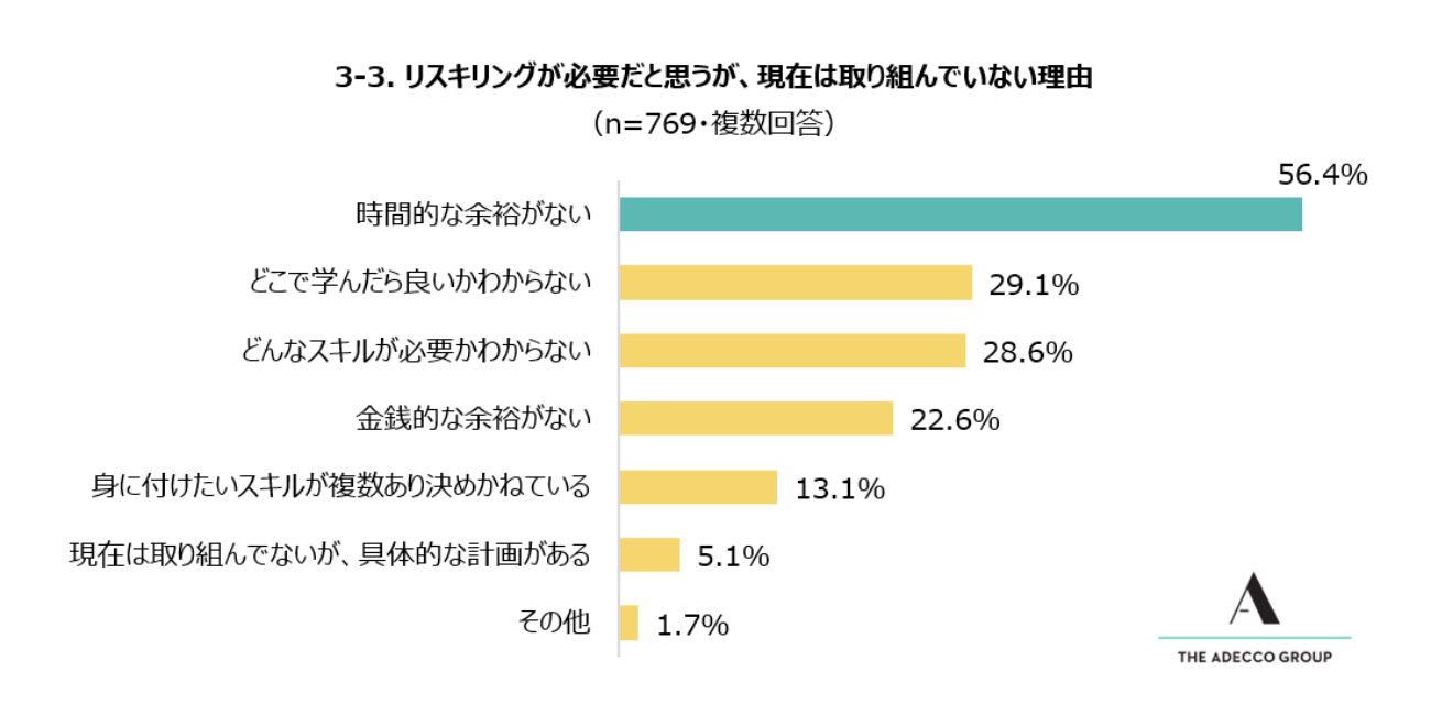 「必要だと思うが現在は取り組んでいない」と答えた769人に対し、その理由を複数回答で質問すると、一番多かった答えは「時間的な余裕がない(56.4%)」。次いで「どこで学んだら良いかわからない(29.1%)」「どんなスキルが必要かわからない(28.6%)」「金銭的な余裕がない(22.6%)」と続いた。
